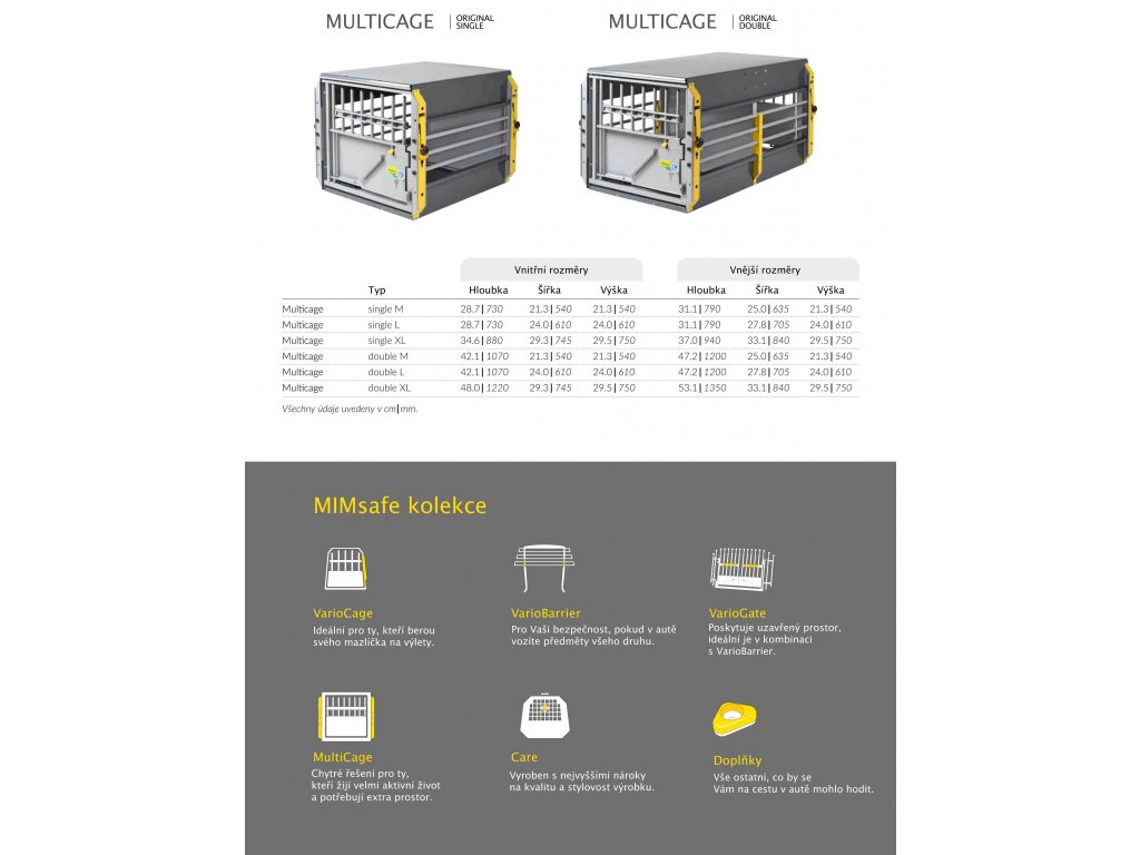 MultiCage je bezpečná prepravná klietka štvorcového tvaru, ktorá je vyvinutá na prepravu predovšetkým v dodávkach, vozidlách typu pick-up či karavanoch. Robustná konštrukcia a špeciálne kotviace príslušenstvo umožňuje spojiť niekoľko klietok dohromady - vedľa seba či na seba.